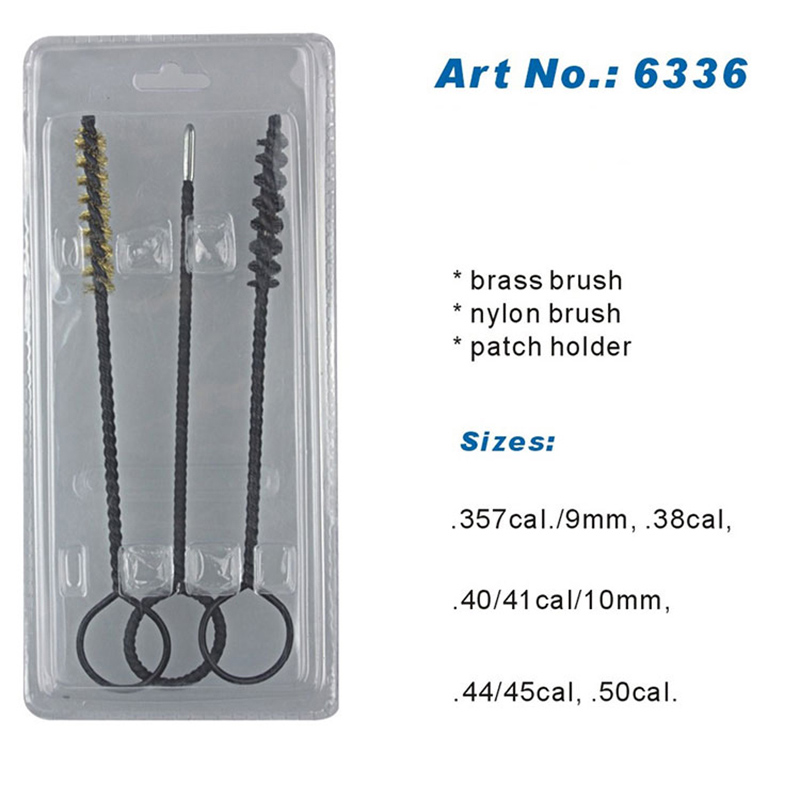 Комплет од 3 комада за чишћење пиштоља, упаковано у дупли блистер. Једна четка за чишћење отвора од месинга, једна четка за чишћење отвора од најлона и један држач закрпа са прорезима. Згодно и ефикасно.