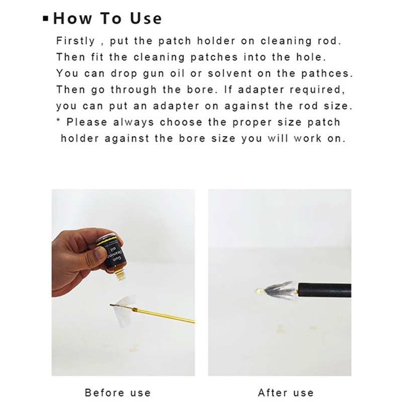 ● Држачи/врхови закрпа за чишћење пиштоља са прорезима 4 величине могу задовољити калибре од .177цал./4.5мм до 12 Гауге, погодне за пушке, пиштоље, сачмарице.