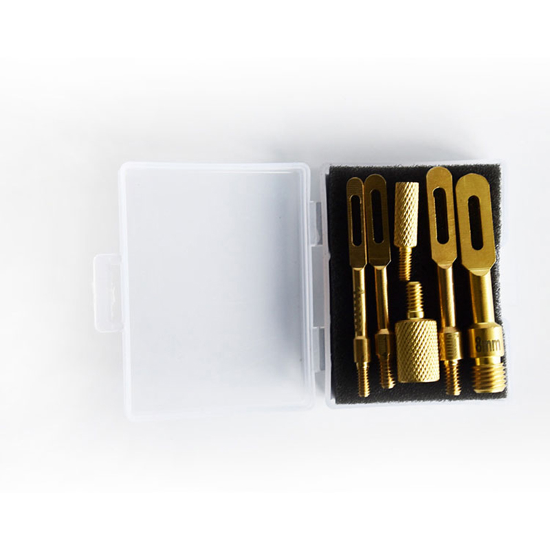 ● 4 држача закрпа: 4мм код мушких 5-40, одговара за пушке .177-.223; 5мм је код мушкараца 8-32, одговара за .223-.270цал. пушке; 6мм код мушкараца 5-40, одговара за пушке .270-.357цал, пиштоље .357-.45цал.; 8мм је мушки 5/16-24, одговара за све мераче сачмарица и пиштоље од .357цал. и горе.