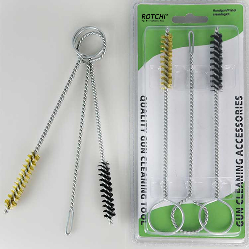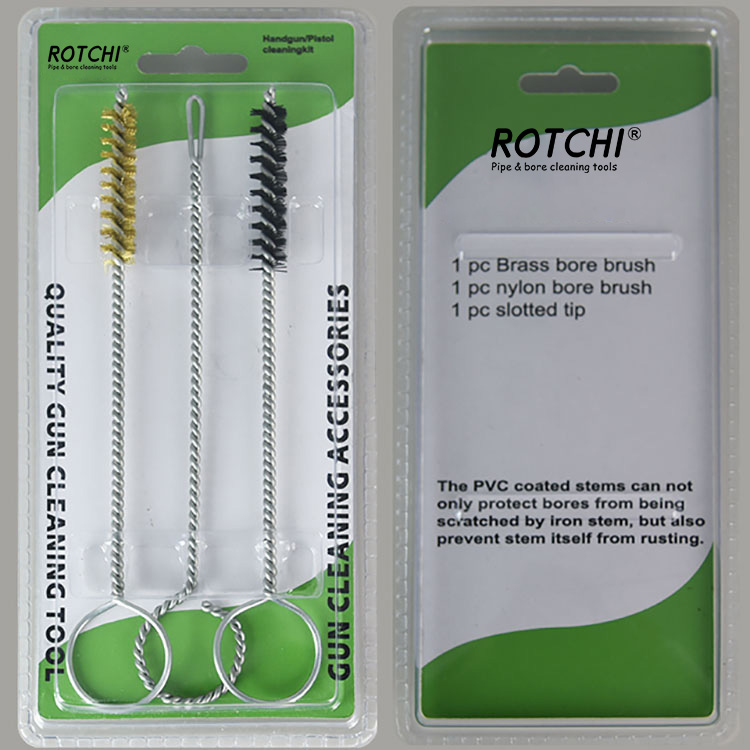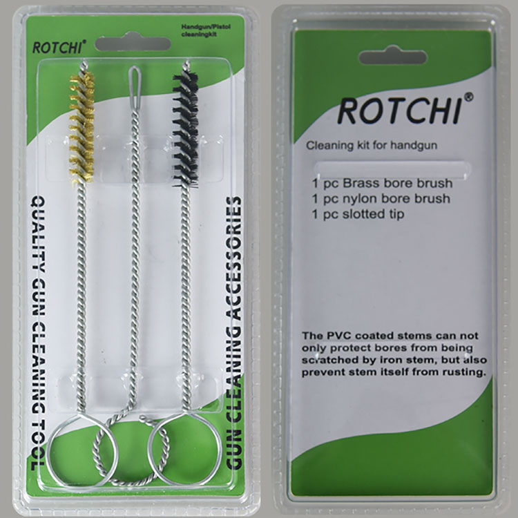3 ком комплета за чишћење пиштоља, упаковано у дупли блистер. Једна четка за чишћење отвора од месинга, једна четка за чишћење отвора од најлона и један држач закрпа са прорезима. Згодно и ефикасно.