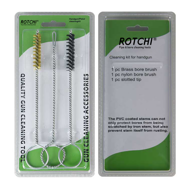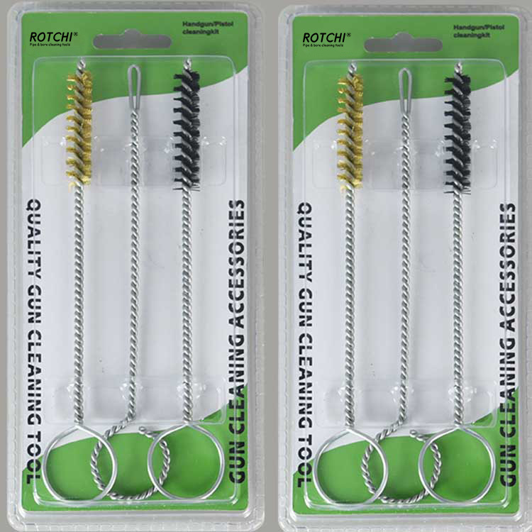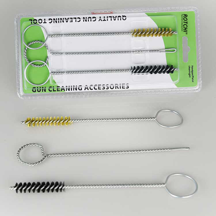 Комплет за чишћење пиштоља од 9 мм у блистеру 3 ком комплета за чишћење пиштоља, упаковано у дупли блистер. Једна четка за чишћење отвора од месинга, једна четка за чишћење отвора од најлона и један држач закрпа са прорезима. Згодно и ефикасно.