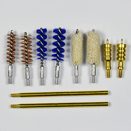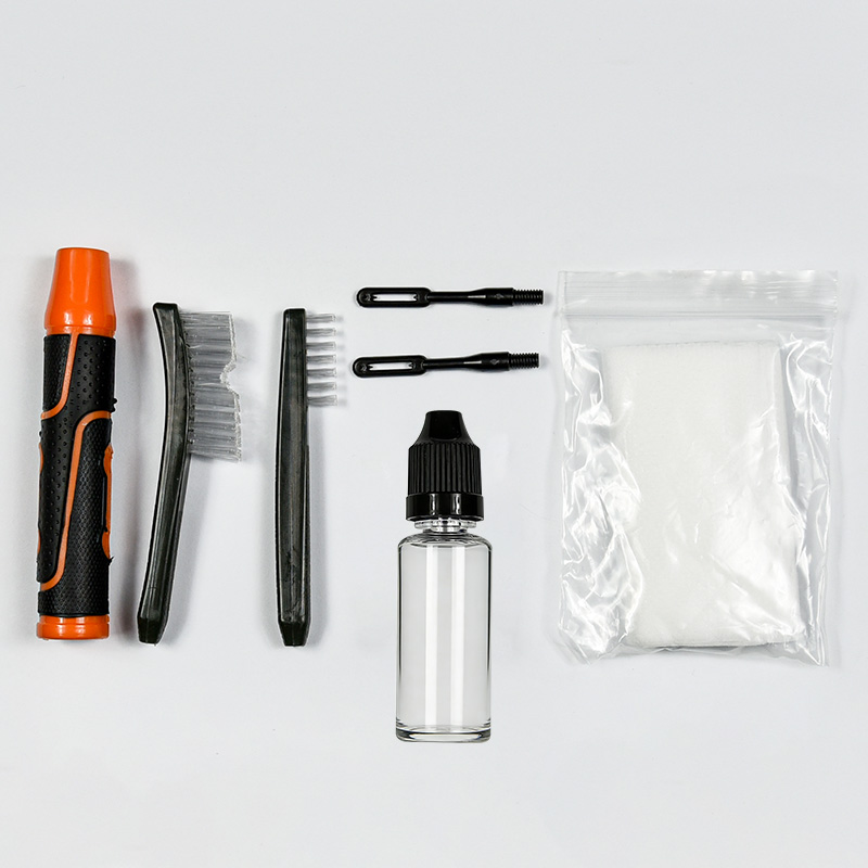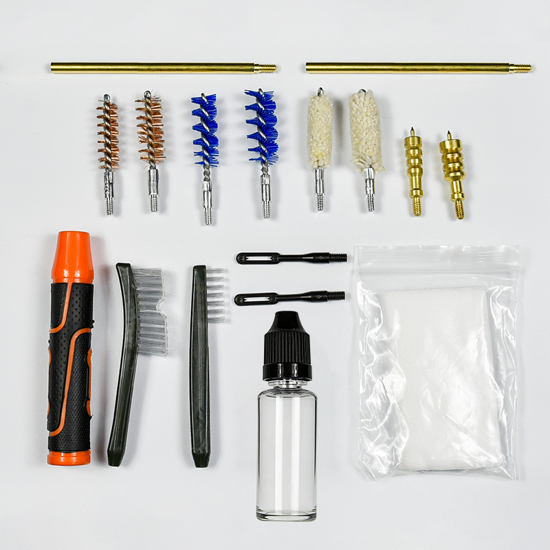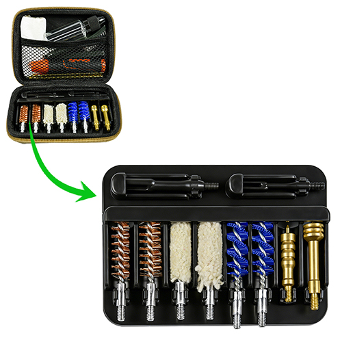 Комплет за чишћење пиштоља укључује 2 величине (9 мм и .45 цал.). ОКС тканина пресвучена ПВЦ торбица са патент затварачем. Месингане четке, памучне крпе, најлонске четке, месингане четке, 2 шипке. Песак и црна боја за избор.