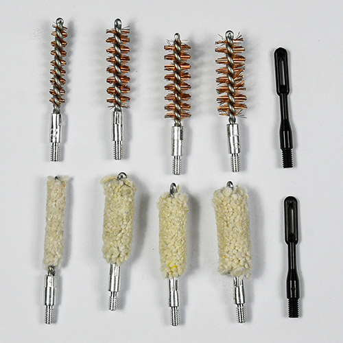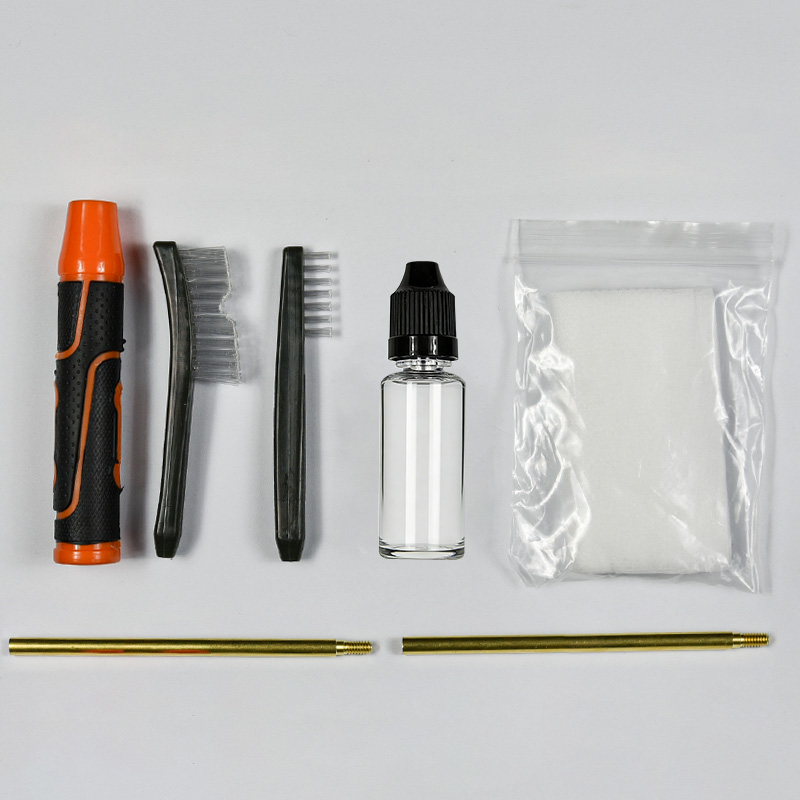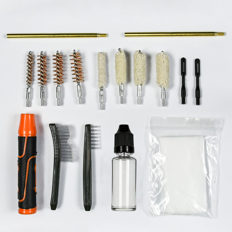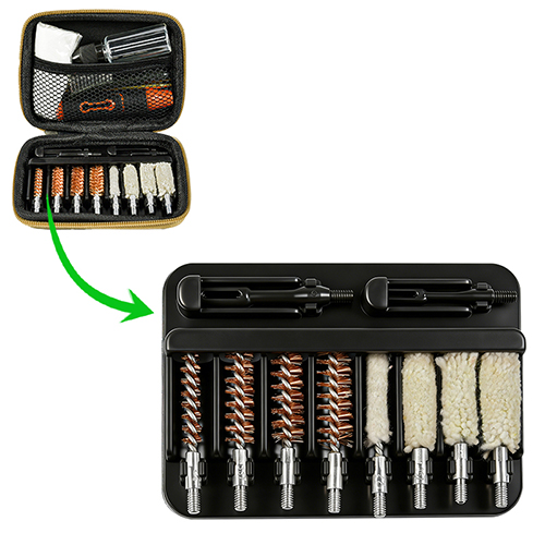 Комплет за чишћење пиштоља укључује 4 величине (.22, 9мм, .40, .45цал.). ОКС тканина пресвучена ПВЦ торбица са патент затварачем. Месингане четке и памучне крпе, 2 шипке. Песак и црно боја за избор.