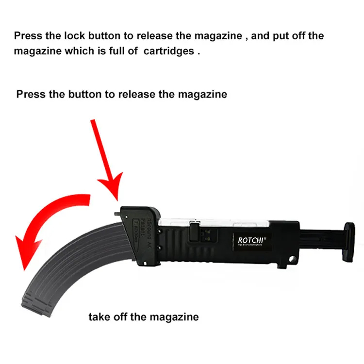 Брзински утоваривач за АК47 ● Користи се за пуњење кертриџа 7,62Кс39 мм у АК магацин капацитета 10/20/30 или више. ● Напуните патроне пуне у жлеб, поставите магацину на исти као АК механички принцип. притисните потисник, патроне ће лако ући у магацин. ● Лако руковање, девојка може да ради веома брзо. ● Снажно тело. Можете видети кертриџе у утоваривачу кроз широки поклопац. Брава контролише да се поклопац не отвара током складиштења. ● Такође може да испразни кертриџе из магацина када не пуцате, али је магацин и даље пун.