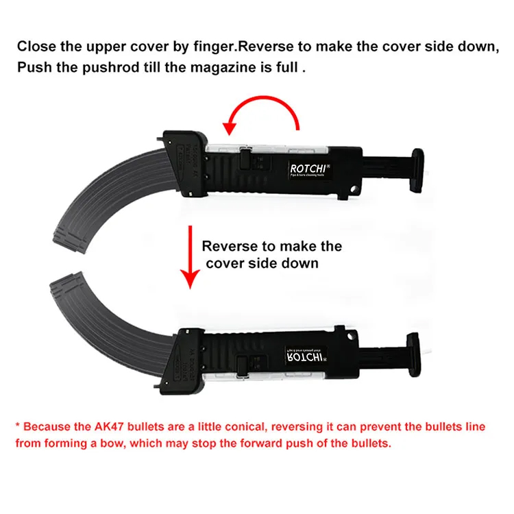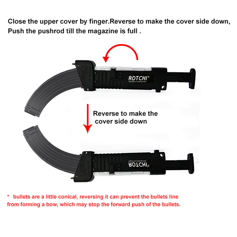 ● Напуните патроне пуне у жлеб, уградите магацин на исти као АК механички принцип. притисните потисник, патроне ће лако ући у магацин.