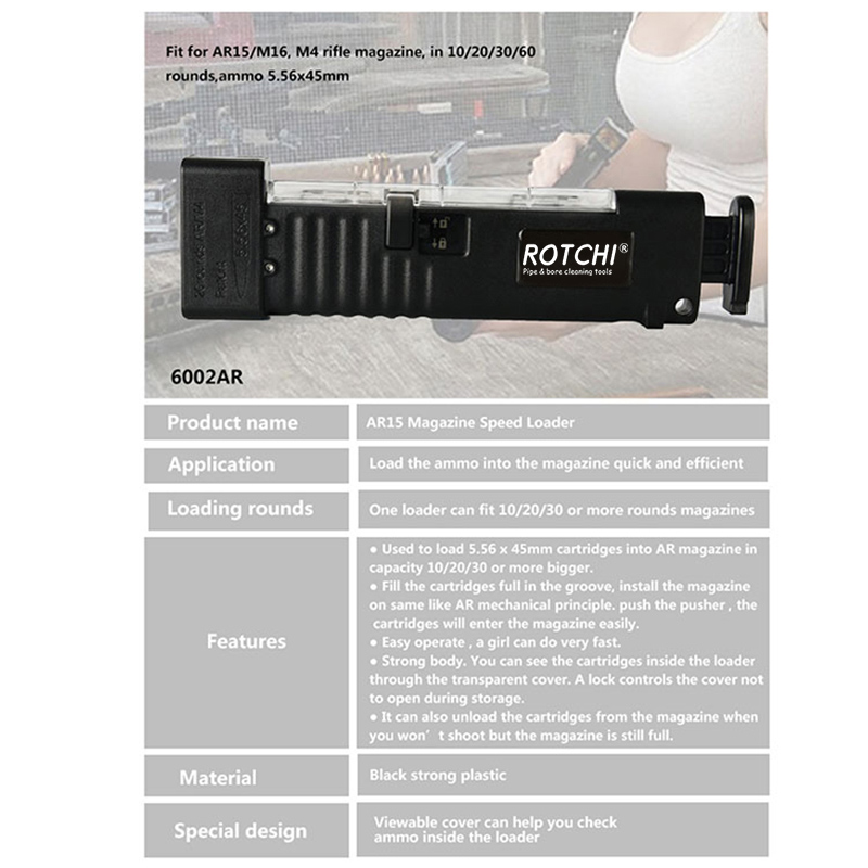 Брзински утоваривач магазина за АР15 ● Користи се за пуњење кертриџа од 5,56 к 45 мм у АР спремник капацитета 10/20/30 или више. ● Напуните кертриџе пуним у жлеб, поставите магацину на исти као АР механички принцип. притисните потисник, патроне ће лако ући у магацин. ● Лако руковање, девојка може да ради веома брзо. ● Снажно тело. Можете видети кертриџе унутар пуњача кроз провидни поклопац. Брава контролише да се поклопац не отвара током складиштења. ● Такође може да испразни кертриџе из магацина када не пуцате, али је магацин и даље пун.